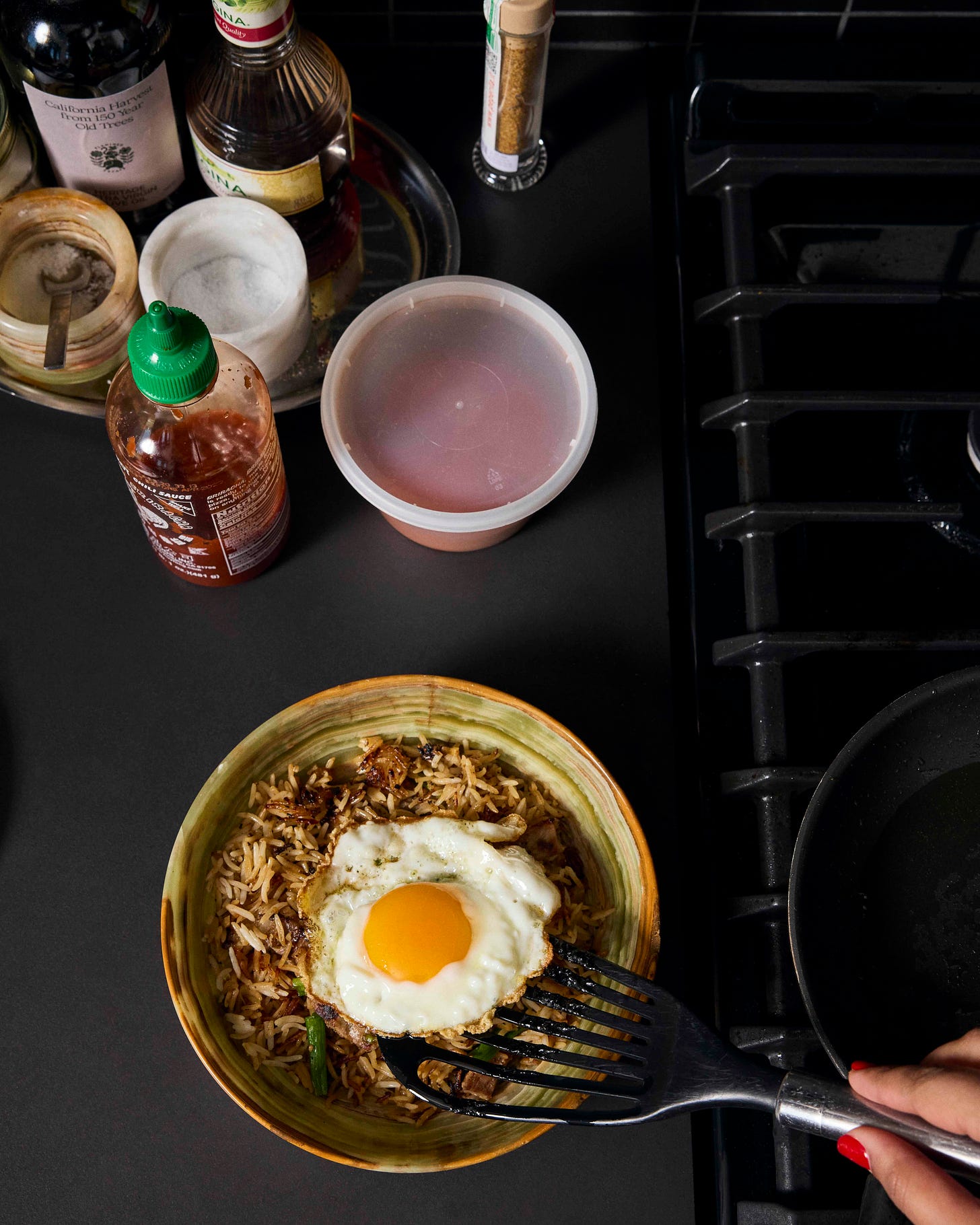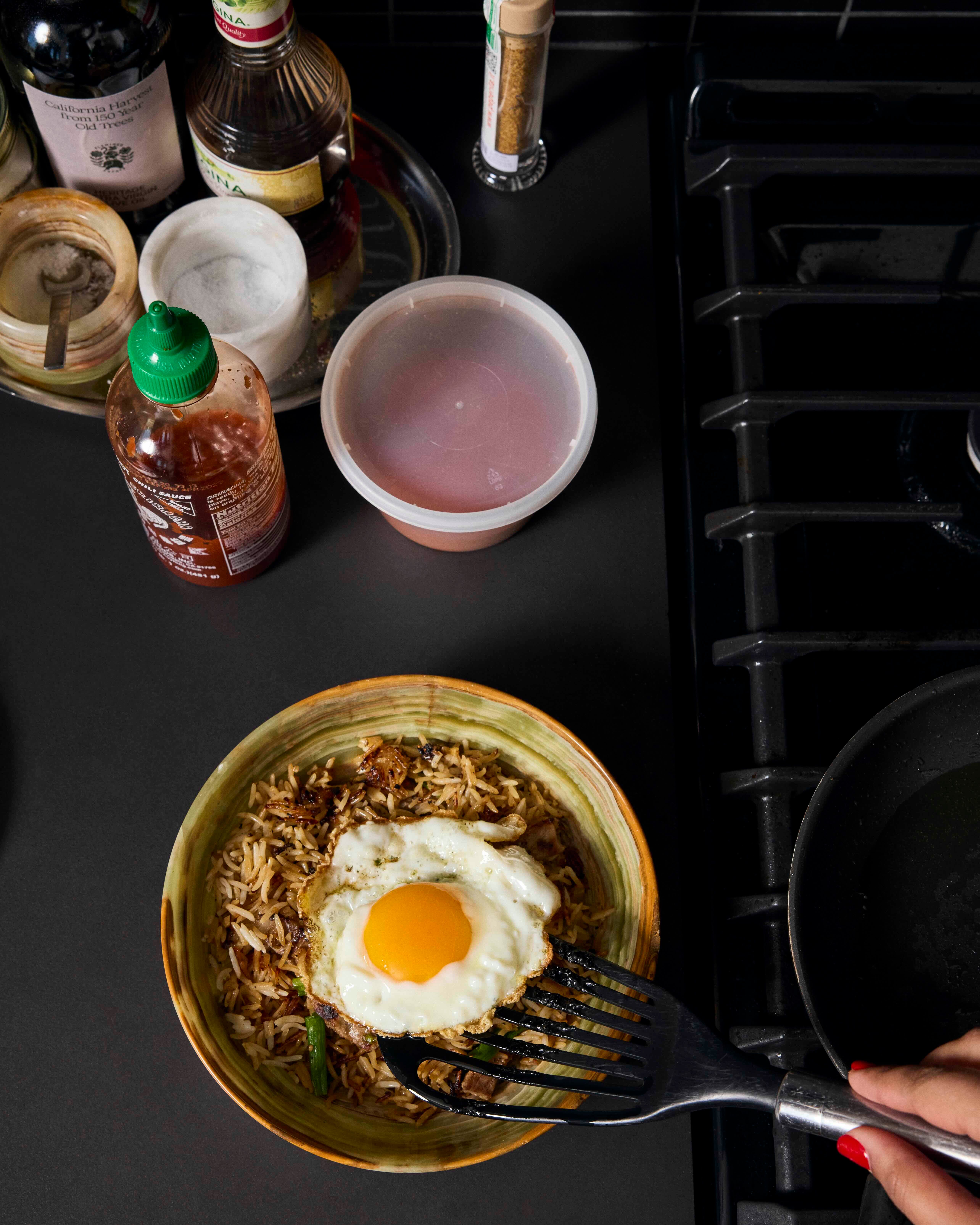 Serve with crispy fried eggs, sriracha, pickled kachumber, and more black pepper and soy sauce, if desired.